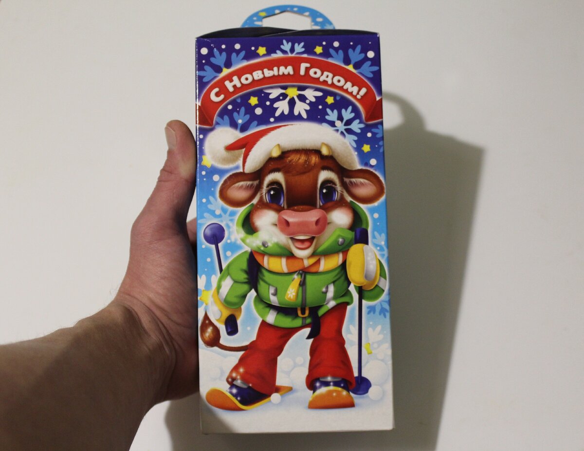 Подарок упакован в простенькую коробку с изображением символа наступающего года - бычка на лыжах.