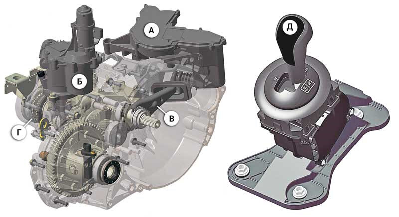 За это действие отвечает имеет штоковый привод сцепления, электромеханические приводы выбора передач и актуатор. Детали выпускаются компанией ZF, поставляющей приводы нескольким европейским автомобильным концернам («Пежо», «Ситроен» и пр.). Работа системы контролируется электронным блоком управления (ЭБУ). Он связан с рычагом выбора режима и системой индикации.