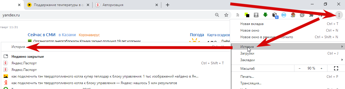 1) Открываем браузер - нажимаем на три точки справа вверху - выбираем - История - История