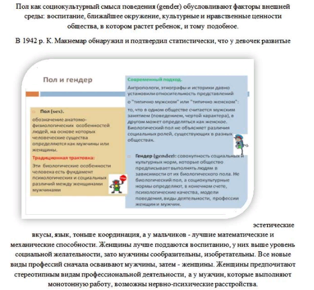 социализации ребенка через усвоение общественного опыта. Основную роль в ней играют полоролевые представления. На основе полоролевых представлений (стереотипов), усвоения половых ролей (идентичностей) формируется половое самосознание индивида - осознание себя мужчиной или женщиной и необходимости выполнения соответствующих социальных ролей. Преимущественно мужской стиль поведения и общения