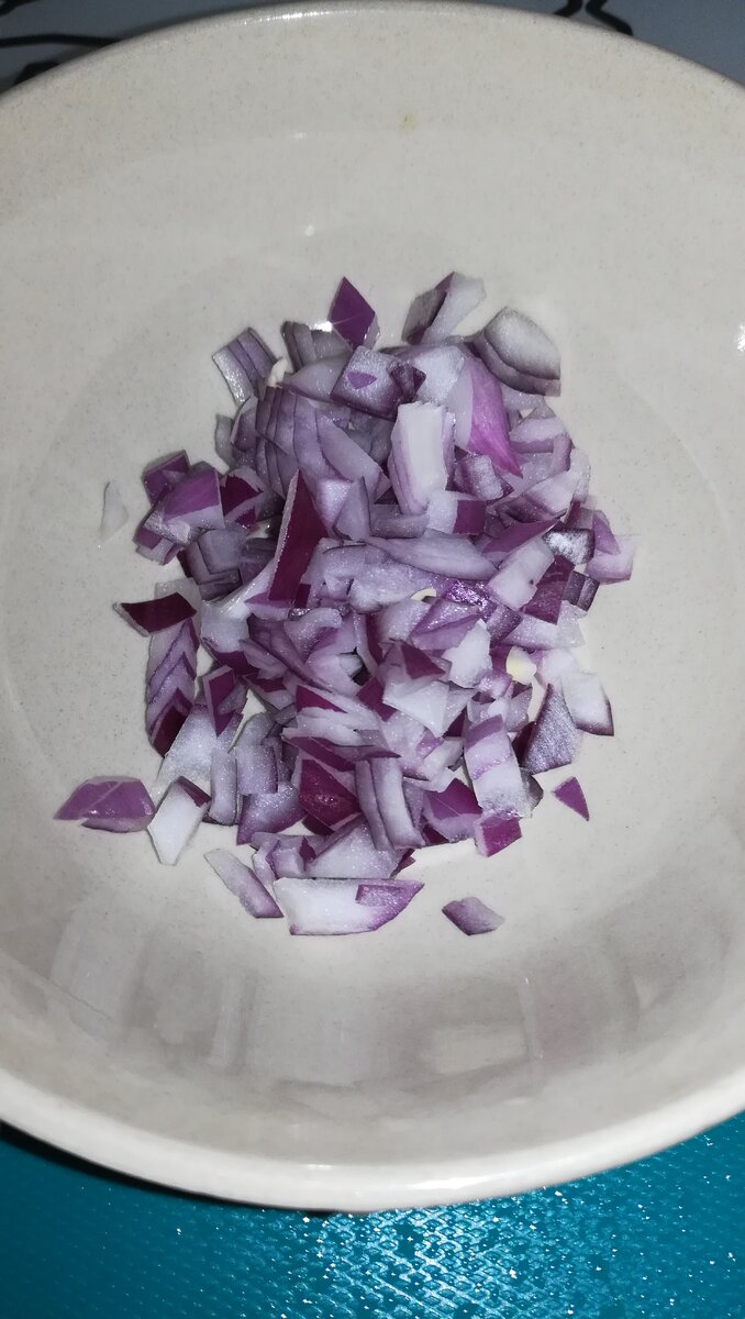 Далее в ход идут помидоры. Их также мелко рубим ножом. Затем небольшим кубиком режем красный лук. Пора все ингредиенты перемешать и сделать вкусную заправку. Добавляем к нашему салату сок лимона, горчицу и соль с перцем по вкусу. Все хорошо перемешиваем.