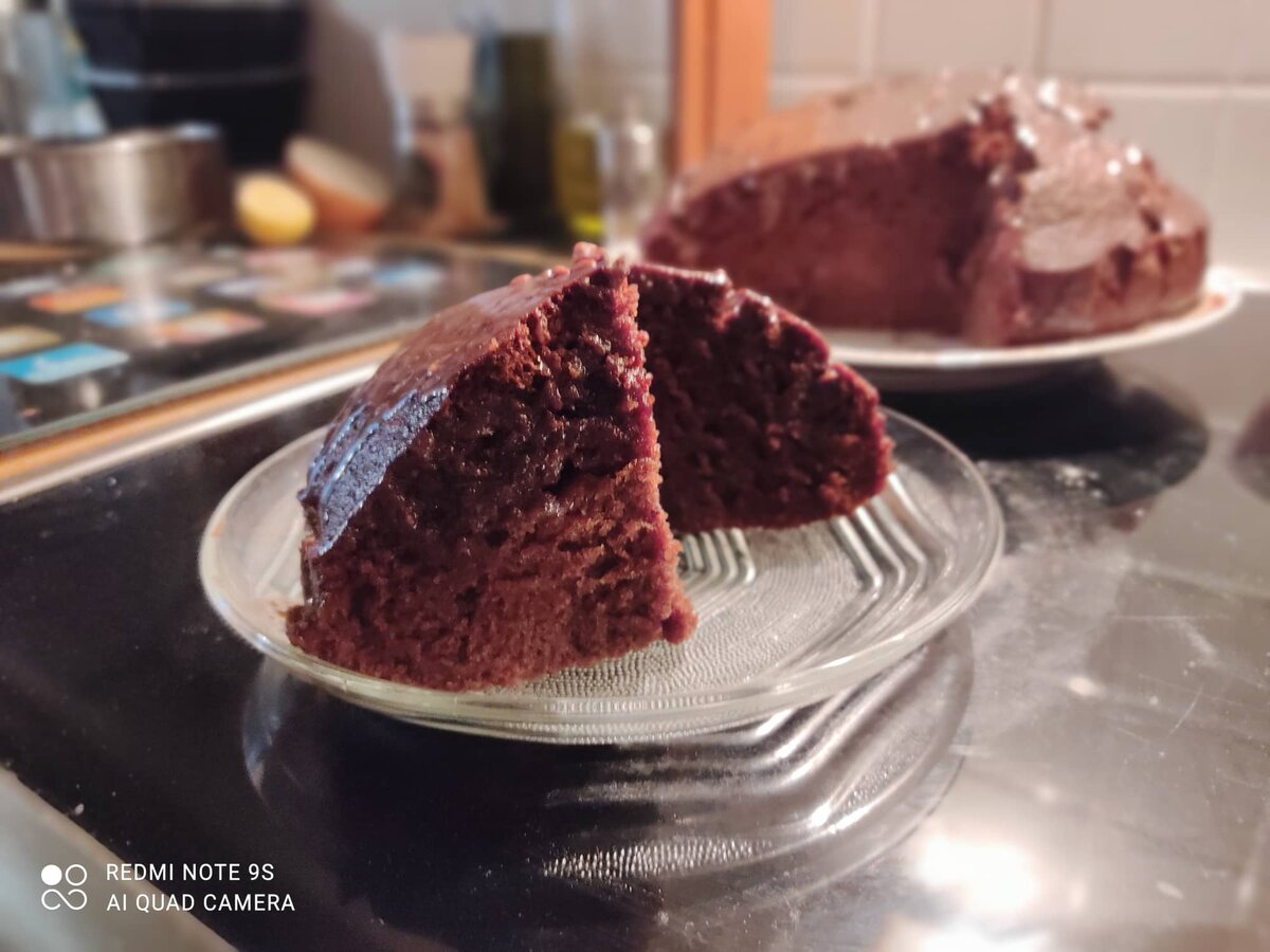 Зато в небольшой форме очень сильно поднялся. Заливаем горячий торт заранее приготовленной глазурью (растапливаем шоколад со сгущенкой и молоком) и можно подавать к столу.