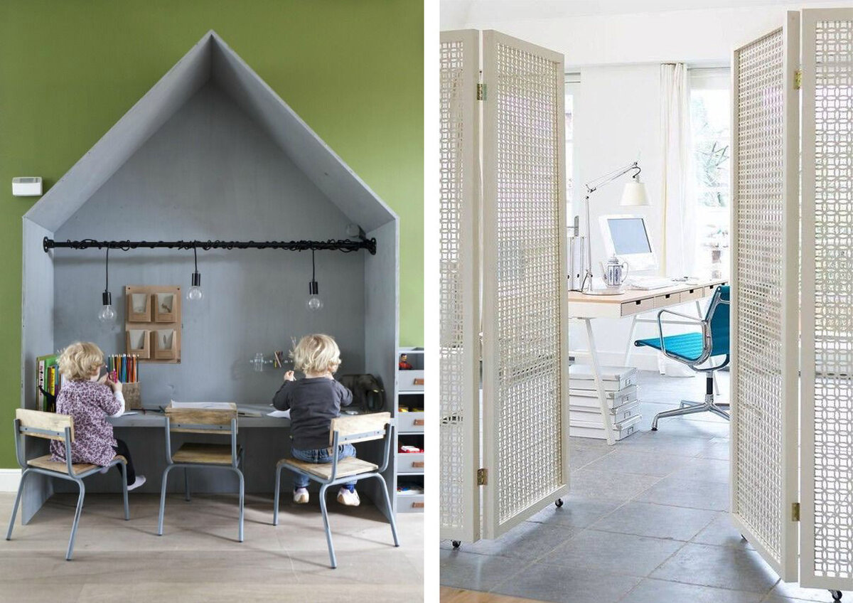 Выбор такого места обусловлен несколькими критериями. Чтобы ребенок не отвлекался на посторонние предметы и игрушки, письменный стол должен быть отделен от игровой зоны. Это можно сделать с помощью ширмы, стеллажа или шкафа для книг.