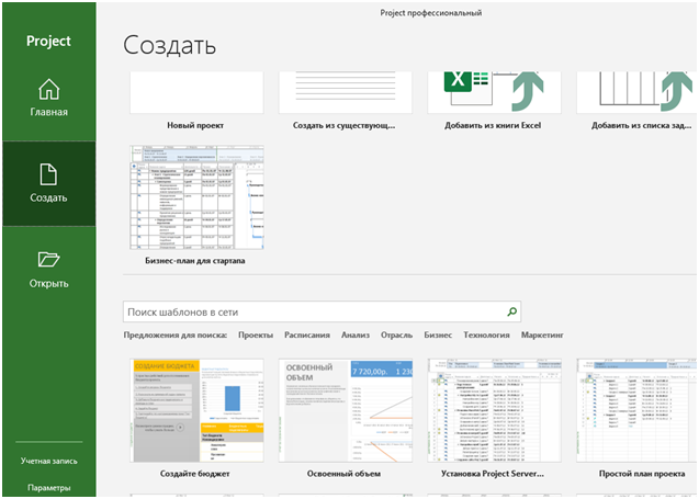 Из примеров (шаблонов) проектов, приведенных на стартовой странице выберите какой-либо пример проекта, например «Бизнес-план для стартапа», и на этом примере познакомимся с интерфейсом, меню и некоторыми базовыми командами MS Project.