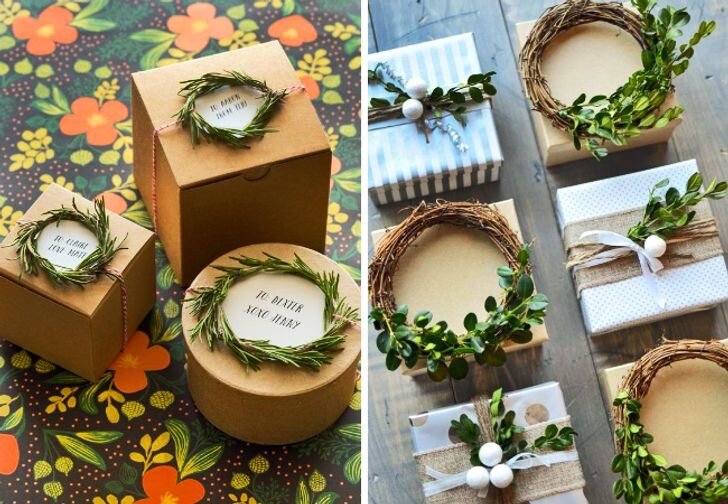Коробочки с подарками можно украсить тонкими ветвями вечнозеленых растений - например туи, розмарина. Сами коробочки можно легко сделать из картона самостоятельно.