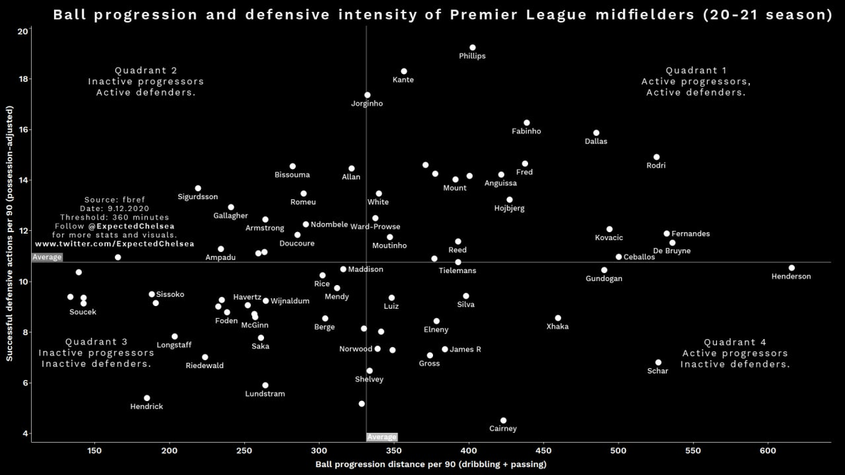 Самый шок – позиция Жоржиньо. Итальянец чуть активнее среднего двигает мяч, зато залетает в топ по объему успешных действий в защите. Успешных, а не общих. То есть речь про качество, а не про количество. Надо присмотреться.