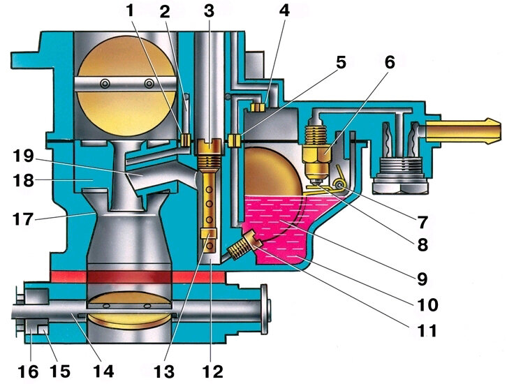 - Эконостат находится во вторичной камере карбюратора. На схеме он условно показан в первичной камере.