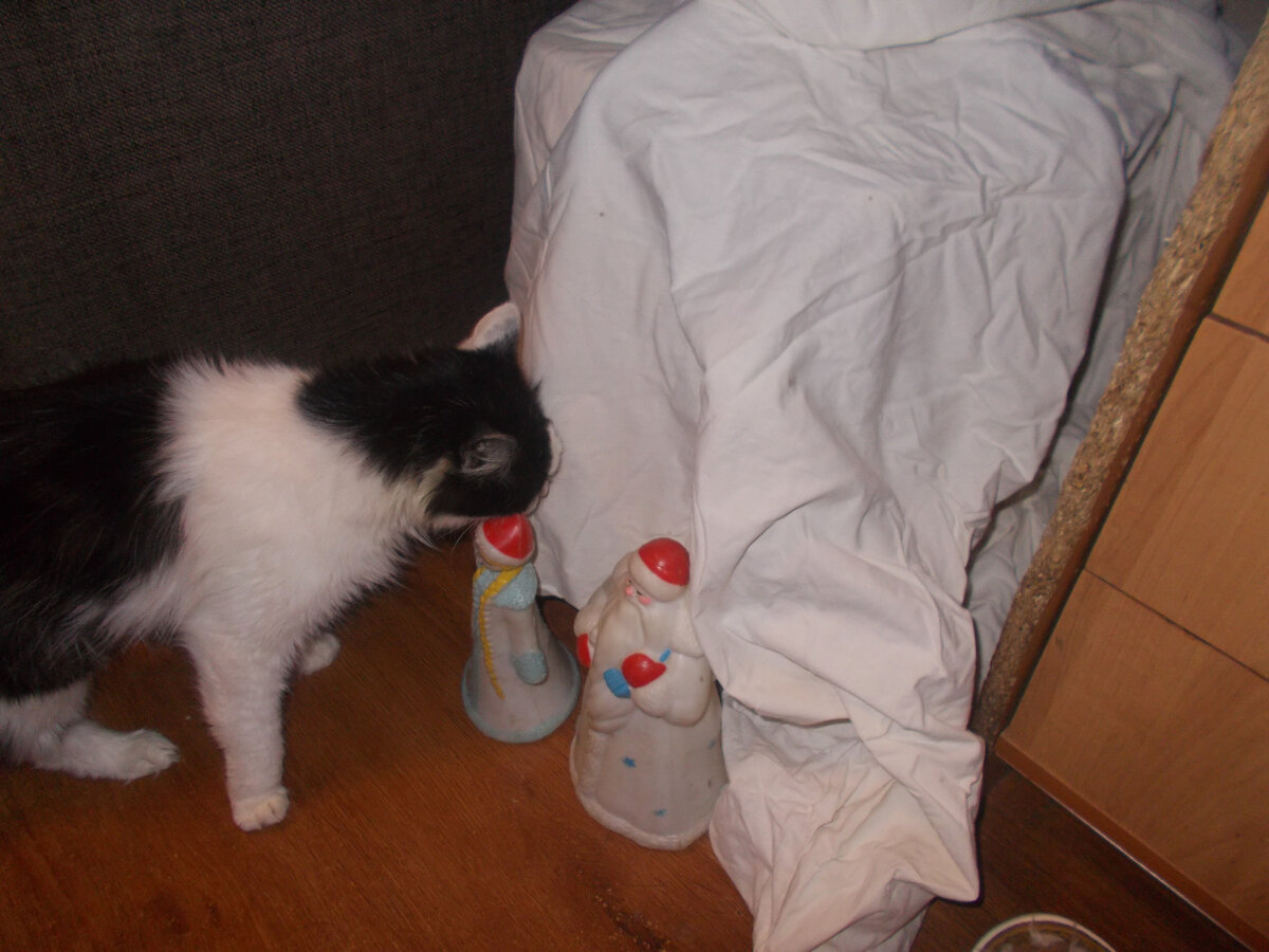 Двуногим, опять-таки, надлежит бдить, дабы коты не нажевались "дождика" (проще всего его вообще не использовать), не побили игрушки (не используем стеклянные или вешаем их в недоступные места), да и в принципе не повалили елку (ёлку надежно привязываем, в идеале или огораживаем, или прикручиваем на потолок, или в такое помещение, в котором коты не водятся. Но это в идеале. И многое зависит от самих котов. С нашими котами вполне хватает просто зафиксировать елку).