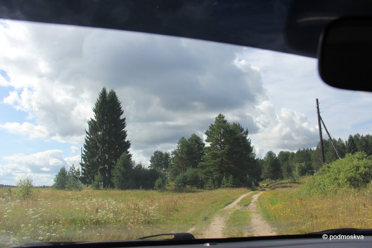 Дело было этим летом. Ехали мы в Архангельск из Москвы. Собирались ночевать в Вельске, по пути заезжая в разные интересные места. Так и сюда забрались. Дорожка как-то сама поманила, повела и я свернула с трассы. У вас наверняка тоже так бывало) Хотелось немного отвлечься. Получилось. Грунтовочка посреди леса очень тому поспособствовала. Удивительно и даже странно, но на этот раз я не помню названия этой деревни, но вам покажу.
