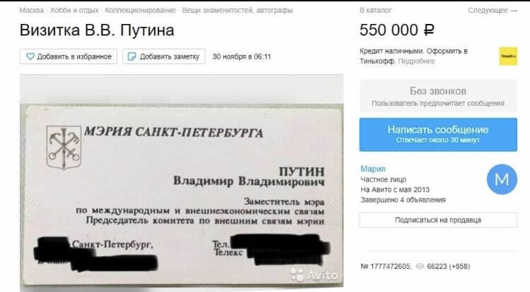 На авито выставили на продажу визитку Путина за 550 тысяч