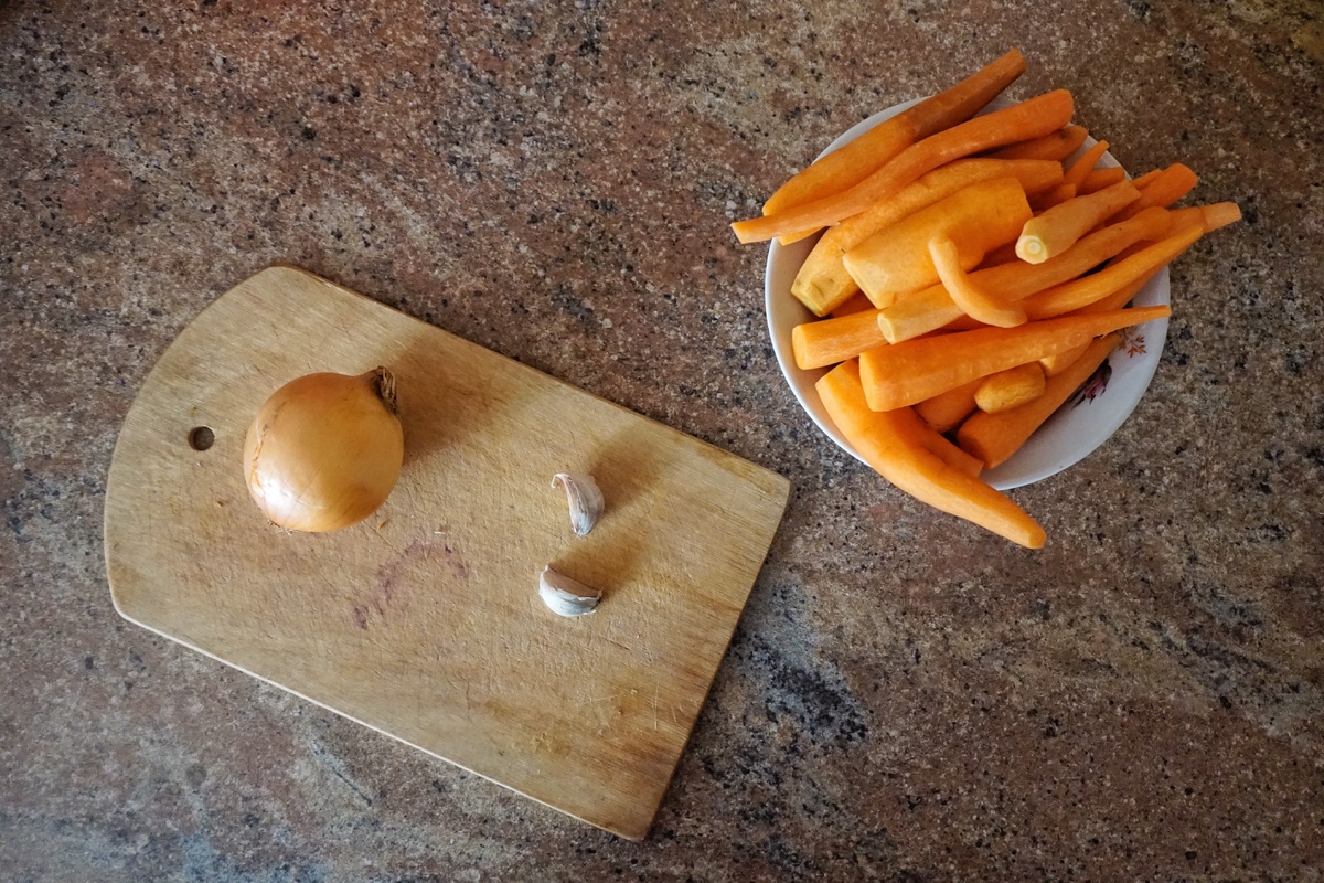 ⠀⠀Сковородку снял с огня, достал кастрюлю для супа. И приступил к резке лука. Луковицу очистил, разрезал пополам и нашинковал. Зубчики чеснока раздавил ножом, после чего снял кожуру. В кастрюлю налил растительного масла, по богатому. Лук и чеснок загрузил туда и стал тушить до размягчения первого. После чего добавил кусок сливочного масла, грамм 25 и порезанную на кружки морковь. Продолжил тушить еще какое то время. Затем залил содержимое кастрюли водой. Воды взял столько, чтобы она только только закрыла морковь. Довел до кипения, убавил огонь и варил до мягкости моркови. Параллельно поставил кипятиться чайник.