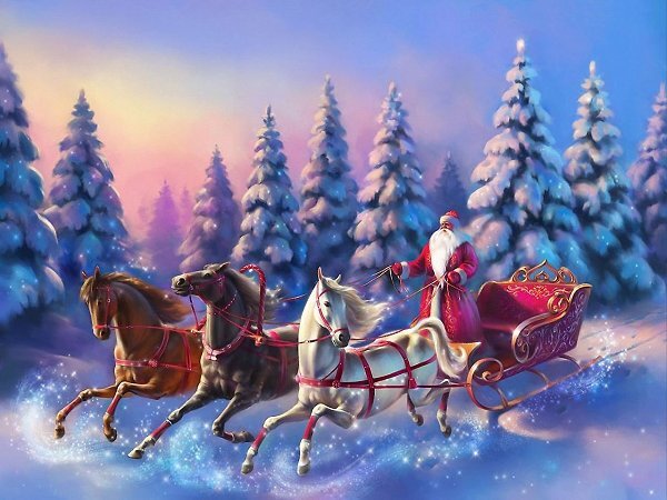 Старик Василий вывел волшебных коней, запряг в сани. Дед Мороз поставил в них огромный мешок с подарками, уселся, взял в руки вожжи… Василий махнул рукой: «С Богом!» Волшебные кони взлетели и в снежном вихре понесли по небу сани с подарками и счастьем… И хотя у людей Рождество ещё будто бы не наступило, старик не только дарил подарки как положено Деду Морозу, но и забирал горе людское, как дано Святому Николаю… Потому что это только люди на своих человеческих часах и календарях могут перепутать время и даже забыть о Рождестве. Но там где живут Дед Мороз, Святые Николай и Василий, где горит Звезда Рождества, никакого времени нет, только вечность…