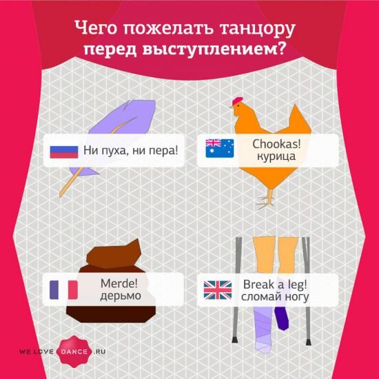 К слову, во Франции вместо «Good luck–Break a leg» используют красноречивое выражение «Merde» (дерьмо)… Его история началась в те времена, когда люди ездили на лошадях и в каретах. Больше лошадей — больше помета — больше зрителей. А если захотите пожелать удачи танцору по-австралийски, смело говорите «Chookas», что на австралийском сленге означает «курица». В начале 1900-х курица считалась деликатесом, и если набирался полный зал, танцор мог позволить купить себе блюдо из курицы.