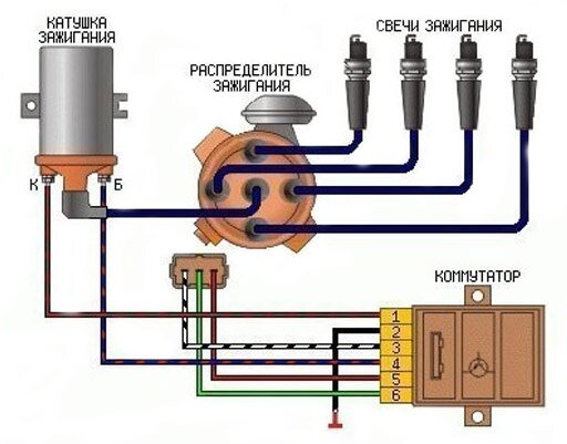 При вращении коленвала, датчик распределитель формирует импульсы напряжения и передает их на коммутатор. Тот в свою очередь создает импульсы тока в цепи первичной обмотки катушки зажигания. В момент прерывания тока индуцируется ток высокого напряжения и подается на центральный контакт распределителя. Отсюда ток подается на свечи зажигания, которые воспламеняют топливно-воздушную смесь.