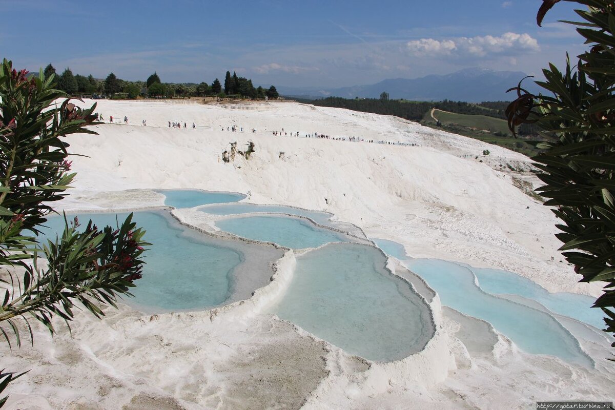 Белоснежные террасы Памуккале входят в обязательную программу любого туриста, добравшегося до Средиземного побережья Турции. Как правило, большинство приезжает в этот парк на один день. Этого вполне достаточно для обзорной экскурсии. Не спорю, но нам спешить было некуда, и мы без колебаний, купили двухдневный тур у местной компании. Русскоговорящими в автобусе оказались только мы. Если, конечно, не считать группу украинцев, которые предпочитали немецкий. По этой причине, гид вёл экскурсию на английском и немецком языках. И это, в конечном итоге, оказалось нам на руку. Приехав в Памуккале, мы отделились от основной группы, предварительно уточнив место и время встречи, и пошли исследовать комплекс самостоятельно.Времени нам, на неторопливый променад, не хватило. Обратно мы бежали … кувырком, дабы не опозорить русскую нацию перед пунктуальными немцами.К нашему удивлению, ни автобуса, ни гида, ни туристов на месте не оказалось.Прождав студенческие пятнадцать минут, я обратилась к дежурившему неподалёку полицейскому. -Нас забыли. Группа уехала. Помогите.Оформляя тур, мы, благоразумно, сохранили визитку агентства. Через 15 минут за нами пришла машина, нас очень быстро разместили в отеле, накормили, и предоставили самим себе.Отель оказался прямо у подножия травертинов, рядом с парком и удивительным озером аквамаринового цвета! Не тратя время на поиски группы, сытно поужинав, поспешили в парк.Очень жаль, что мы не располагали информацией об отеле заранее! Все, кто останавливаются в этом городке, вечером, встречают заказ на склоне белой горы, посреди удивительных террас, и потом по белоснежной дороге, образованной этими поликристаллическими породами, спускаются к городку.Световое шоу, без всяких LED-технологий, с участием солнца! Умопомрачительный спектакль! Многие, наверное, видели в интернете фотографии этих розовых террас. Проход к ним от подножия горы был закрыт. Нам оставалось довольствоваться видом уходящего солнца стоя у кромки воды, того самого, изумительного лазурного озера, которое, то и дело, попадало в объектив камеры, при тщетных попытках запечатлеть себя любимых на фоне потрясающих пейзажей, и так, чтобы в кадре были мы и эта “хлопковая архитектура”.У этого сказочного места есть закрепившееся название “Хлопковый замок”. Так переводится слово “Pamukkale”. Мне не доводилось видеть хлопковые плантации, и поэтому сложно провести такую аналогию, зато образующаяся на скалах Байкала наледь, очень сильно напоминает застывшие минеральные натёки, а сама гора, с раскинувшимся у подножия городком, горнолыжную Европу зимой. Вообще, трудно было свыкнуться с мыслью, что это не снег! Особенно вечером, когда в полном одиночестве мы гуляли по парку, смотрели на искрящийся, теперь уже от LED-подсветки, склон, и наслаждались тишиной.В месте, которое, по разным источникам, в год посещает от 1,5 до 2,5 миллионов человек, трудно найти укромный уголок, чтобы попытаться схватить ускользающий шлейф времени. Вот так закрыть глаза, сесть на облачко, и свесив ножки вниз… . Да, да! А потом добавить: — Какая, собственно, смешная вышла жизнь!Ведь у меня за спиной “Священный город” – Иераполис! А я сижу на террасе высохшего бассейна, в трёх минутах ходьбы от разноголосой, разношёрстной, разноцветной, разноликой толпы, и наслаждаюсь телепортацией в прошлое. Кем ж