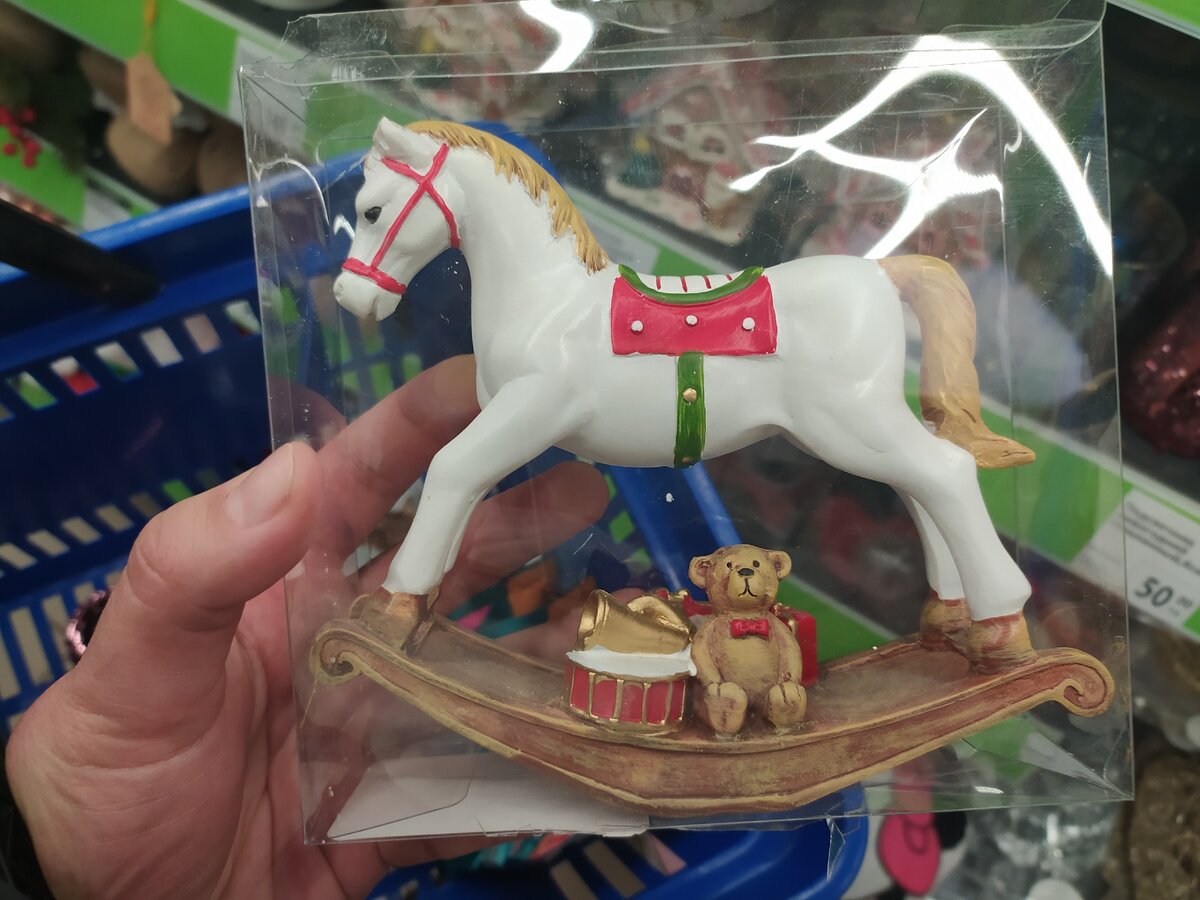 В тот день я набрала в корзину много других нужных покупок (не декора) и долго думала, брать лошадку или нет. Решила с этим переспать. Дескать, если на следующий день всё ещё буду думать, что без лошадки моя ёлка будет грустить, то приду и куплю. И-и-и... к утру я поняла, что какая там ёлка! Я сама грущу без этого скакуна! Но, увы, лошадок смели за день, а я опоздала. Грущу и жду, что их завезут вновь...