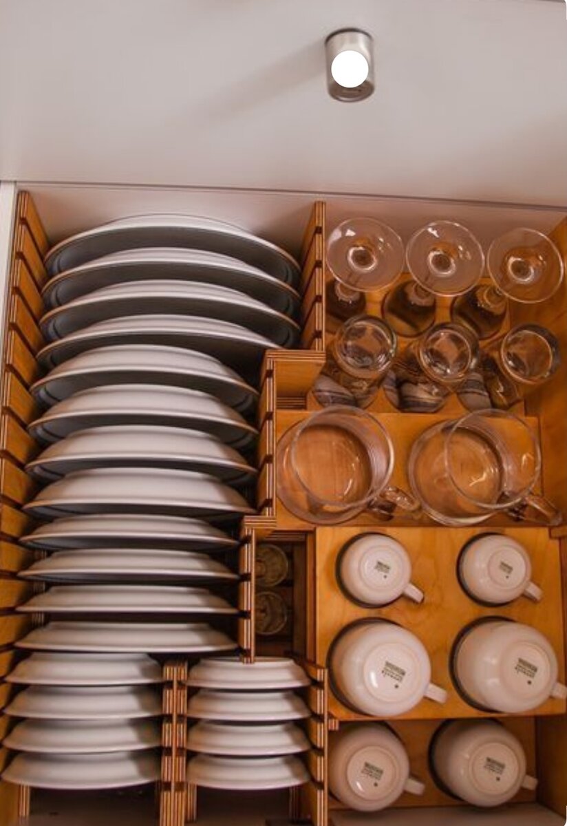 В таком ящике из фанеры посуда будет держаться крепко, надёжно. Но в магазинах такой вариант не встречается. Можно изготовить у мастера или самому, что не так просто. Ещё один минус - прибавка в весе кемпера. Этот эффект стоит минимизировать. Следующее решение кажется проще