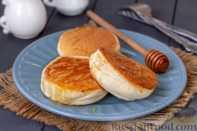 Воздушные японские панкейки готовы. Переложите их на тарелку и подавайте к столу, по желанию полив мёдом.