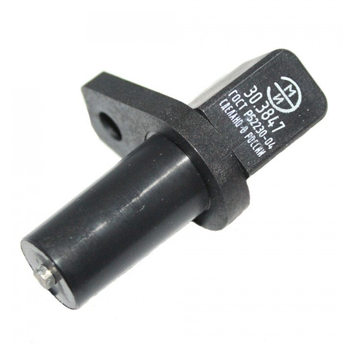 - индуктивного типа. Внутри расположен металлический стержень, имеющий на наружном конце магнит. Он предназначен для намагничивания стержня. Вокруг этого стержня намотана обмотка, из медного провода, концы которой выведены в виде разъёмов для подключения проводов. Принцип работы датчика положения коленчатого вала индуктивного типа: при нахождении стального предмета рядом со стержнем на выводах появляется сигнал.