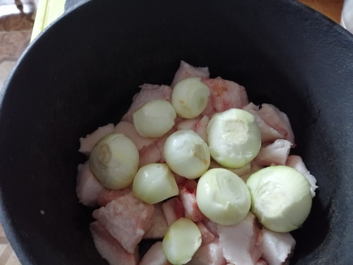 Берём чугунок, казанок или любую посуду для духовки. Я выкладываю все слоями, а можно просто все продукты сложить в казанок, так делают в Украине и готовят в печи, но мы готовим в духовке и так быстрее получается : вниз сало, режу его кусками. На сало лук. Прямо целиком.