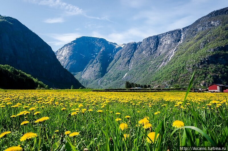 В путешествии по Норвегии наткнулся на райский уголок. Если честно, хочется там умереть. На столько там красиво, необычно, уютно и тихо. Представьте себе небольшое зеленое плато, усыпанное одуванчиками, окруженное горами, по которым стекает множество водопадов. Незабываемые впечатления! А еще рядом находится природный центр Хардангервидда,