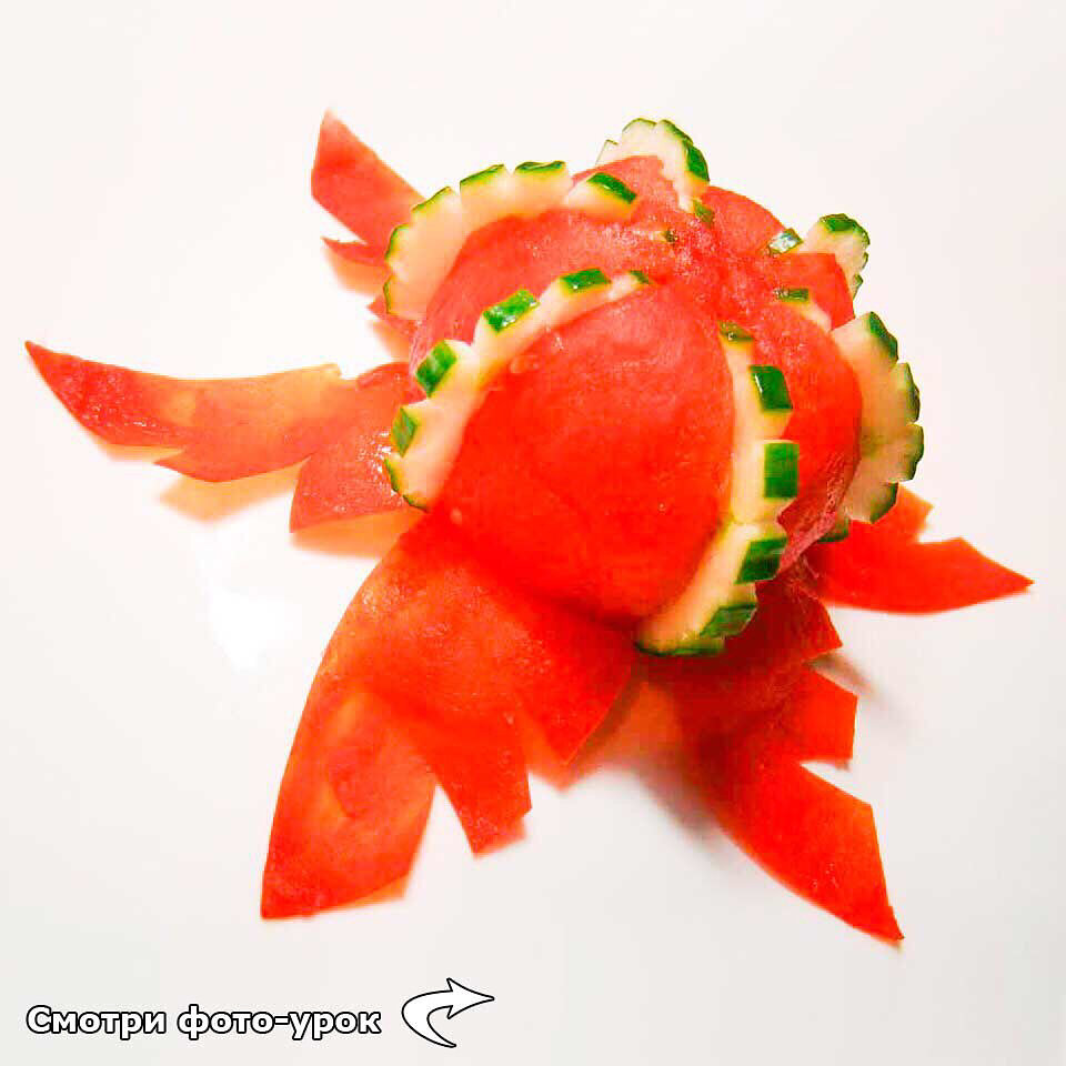 Шаг 7. Осталось вставить дольки огурца в помидор. Для этого толстым ножом сделайте надрезы более глубокими, не сильно, только лишь для того, чтобы эти дольки туда поместились.