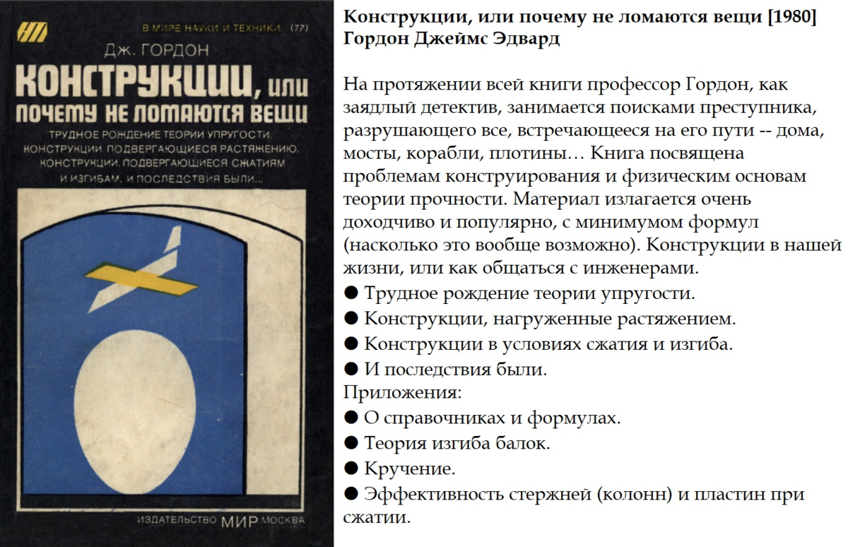 На протяжении всей книги профессор Гордон, как заядлый детектив, занимается поисками преступника, разрушающего все, встречающееся на его пути — дома, мосты, корабли, плотины… Книга посвящена проблемам конструирования и физическим основам теории прочности. Материал излагается очень доходчиво и популярно, с минимумом формул (насколько это вообще возможно). Конструкции в нашей жизни, или как общаться с инженерами.