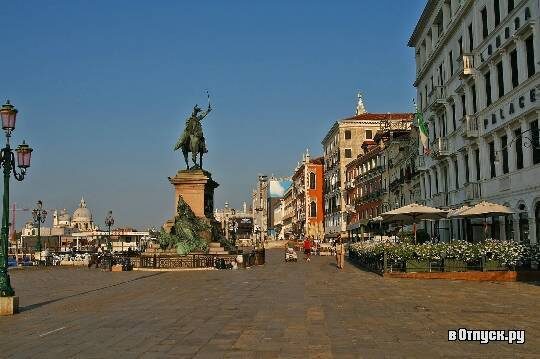 После отеля Danieli Рива дельи Скьявони пересекает канал Рио дель Вин и идет за грандиозным скоплением бронзовых статуй, сделанных скульптором Этторе Феррари в честь Витторио Эммануэле, первого короля Италии. Еще дальше расположена церковь Санта Мария делла Визитацьоне, более известная как Ла Пьета. Некогда это была приходская церковь Антонио Вивальди, который именно здесь написал и исполнил ряд своих произведений. Пьета также примечательна скульптурой 19-го века Мадонны с Младенцем работы Марсили, который отказался от традиционного изображения Христа, величественно сидящего на коленях Девы Марии. У Марсили Христос – это беспомощный ребенок, ищущий материнских объятий.