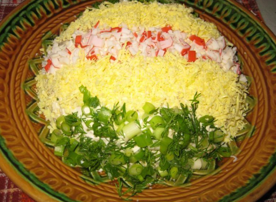Основание салата создается из хорошенько утрамбованной массы тертых крабовых палочек, в форме круга.