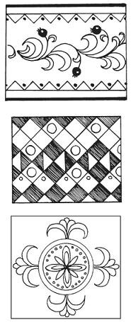 2) Непосредственно аппликации должна предшествовать разработка рисунка, который потом надо будет перенести с бумаги на бересту, учитывая ее цвет, тон, толщину, направление штрихов;