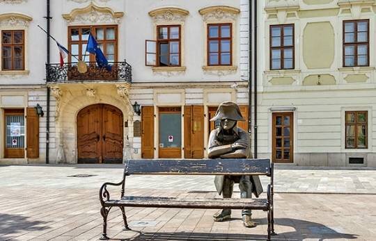 До сих пор нет однозначного мнения, кого же имел в виду скульптор Юрай Мелис, когда создавал бронзовый памятник, изображающий человека в треуголке, опирающегося на лавочку возле французского посольства на Главной площади столицы. Многие туристы полагают, что это сам император Наполеон. Но тогда почему он босой? Очень просто, объясняют местные гиды: его гнали до
