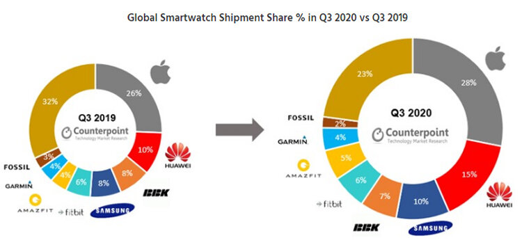 Компания Counterpoint Technology Market Research подсчитала, что мировой рынок умных наручных часов, несмотря на пандемию, в третьем квартале текущего года показал рост на 6 % по сравнению с тем же периодом 2019-го.