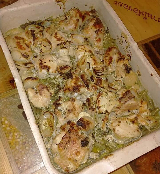Высыпала весь этот зелёный лёд на дно формы и сверху выложила курицу вместе с маринадом.