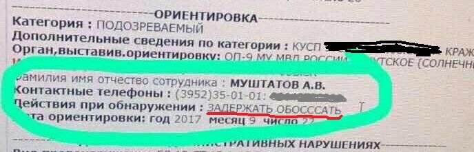 Не легка жизнь полицейского. Чего только не приходится им делать в своей ежедневной работе. Но преступность побеждать как-то надо, да и приказ есть приказ. Любопытный способ подавления воли преступника и профилактики его противоправных действий был предложен неким Муштатовым А.В. - суровым и матерым полицейским. Из переданной им ориентировки на преступника видно сразу — дело свое он знает!Так