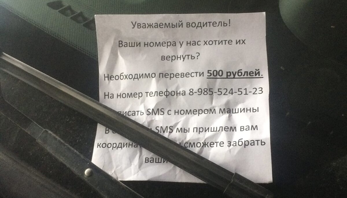 Хозяин машины выходит во двор. Номеров на машине нет. Записка на стекле: «вернём за 500 рублей».