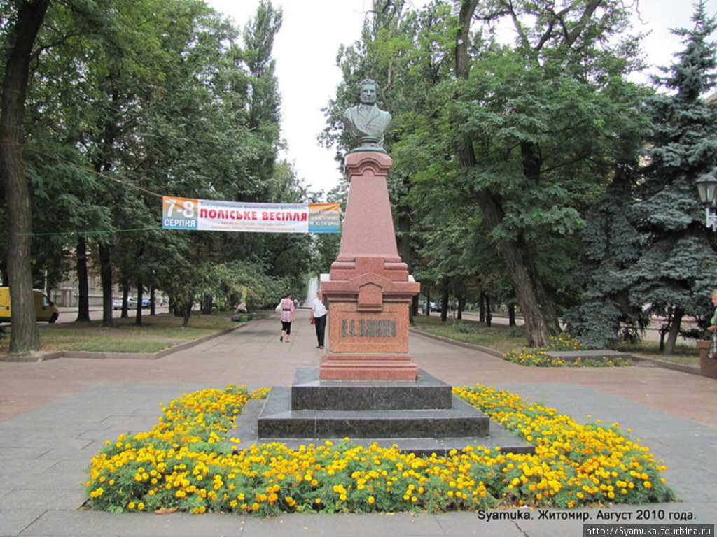 На Старом Бульваре, который ведет к парку, нас встретил памятник А. С. Пушкину, установленный 26 мая 1899 года по случаю 100-летнего юбилея со дня рождения поэта. А вслед за ним - растяжка-реклама о том, что 7-8 августа, т. е. 10 дней назад, в парке проходил Всеукраинский фольклерный фестиваль "Полиськэ вэсилля" :-)).