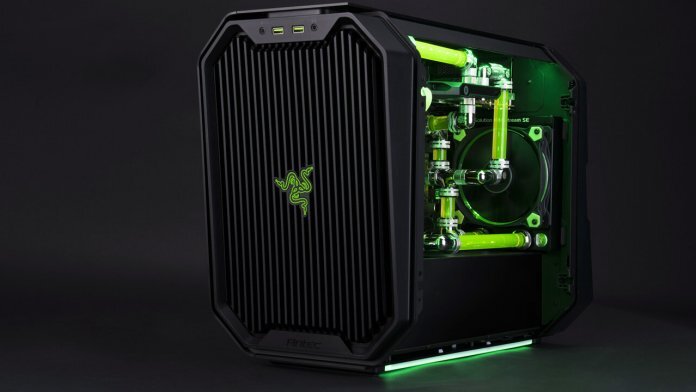 Целых 5 вентиляторов следят за температурой внутри корпуса. Процессор охлаждается с помощью специальной жидкостной системы, которая очень эффектно виднеется из корпуса компьютера. В режиме «турбо» ПК ничего не грозит, так как охлаждающая система выдержит максимальные нагрузки на внутренние комплектующие.