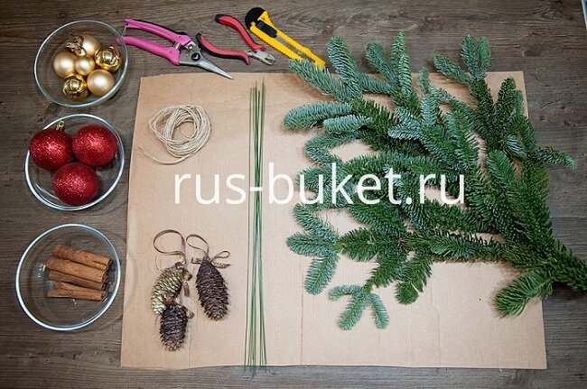 - 15-20 небольших еловых лап (зависит от размера вашего венка).