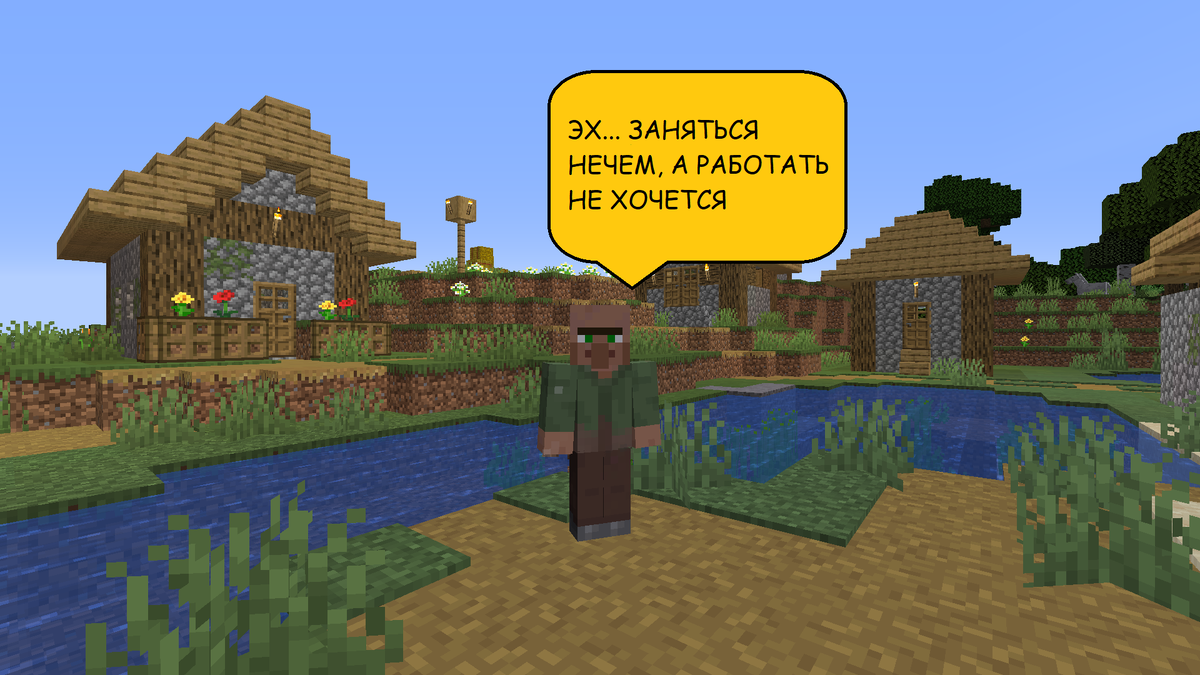 Тогда Лодырь раздобыл где-то деревянный топор и отправился в ближайший лес. К счастью, тот находился всего в двадцати блоках от деревни, поэтому нашему лентяю не пришлось сильно напрягаться. Он и так уже достаточно пересилил себя.