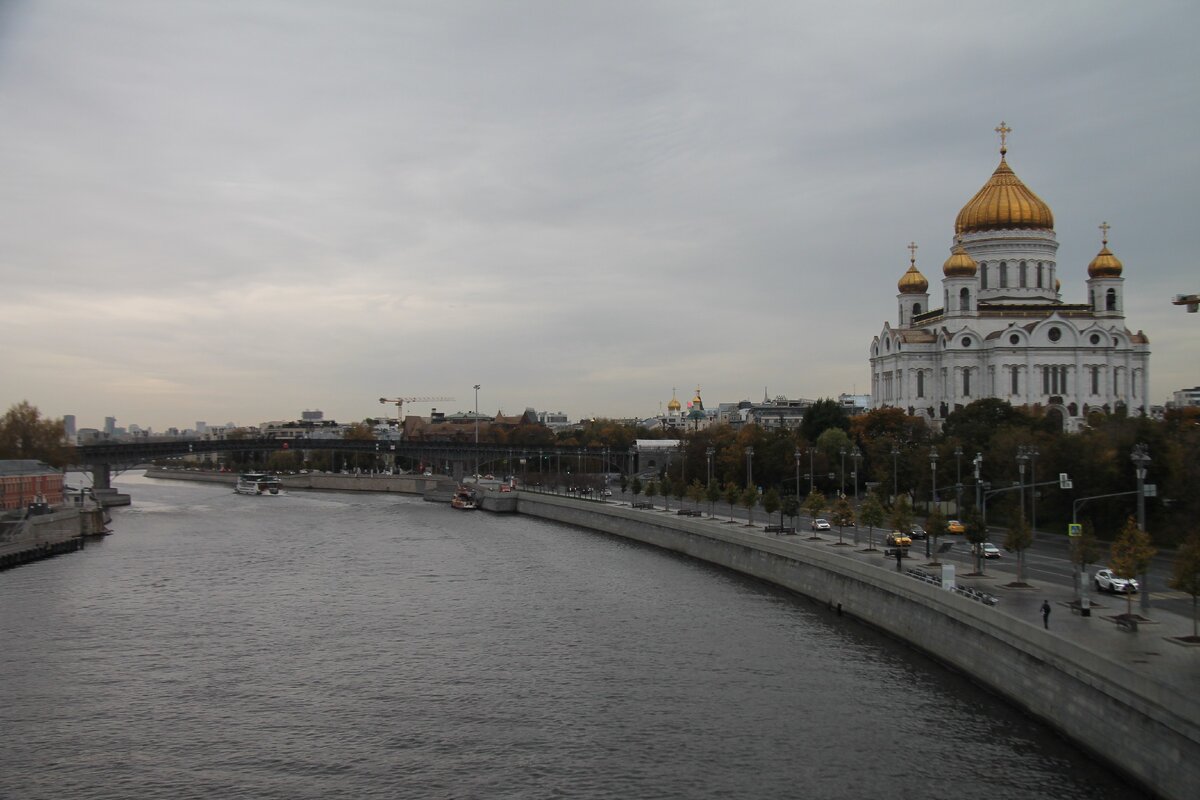 В заключении широкий пешеходный мост от Храма Христа Спасителя через Москву реку и Водоотводный канал: