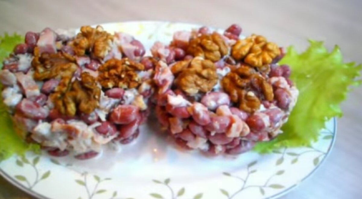 4) выкладываем салат. Сверху украшаем грецкими орехами.