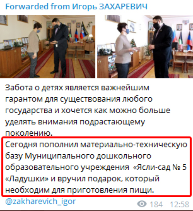 Именно по этому "глава" Дебальцево (Донецкая область) преподнес замечательный подарок муниципальному садику "Ладушки", о чем не преминул упомянуть в своем телеграмм канале.