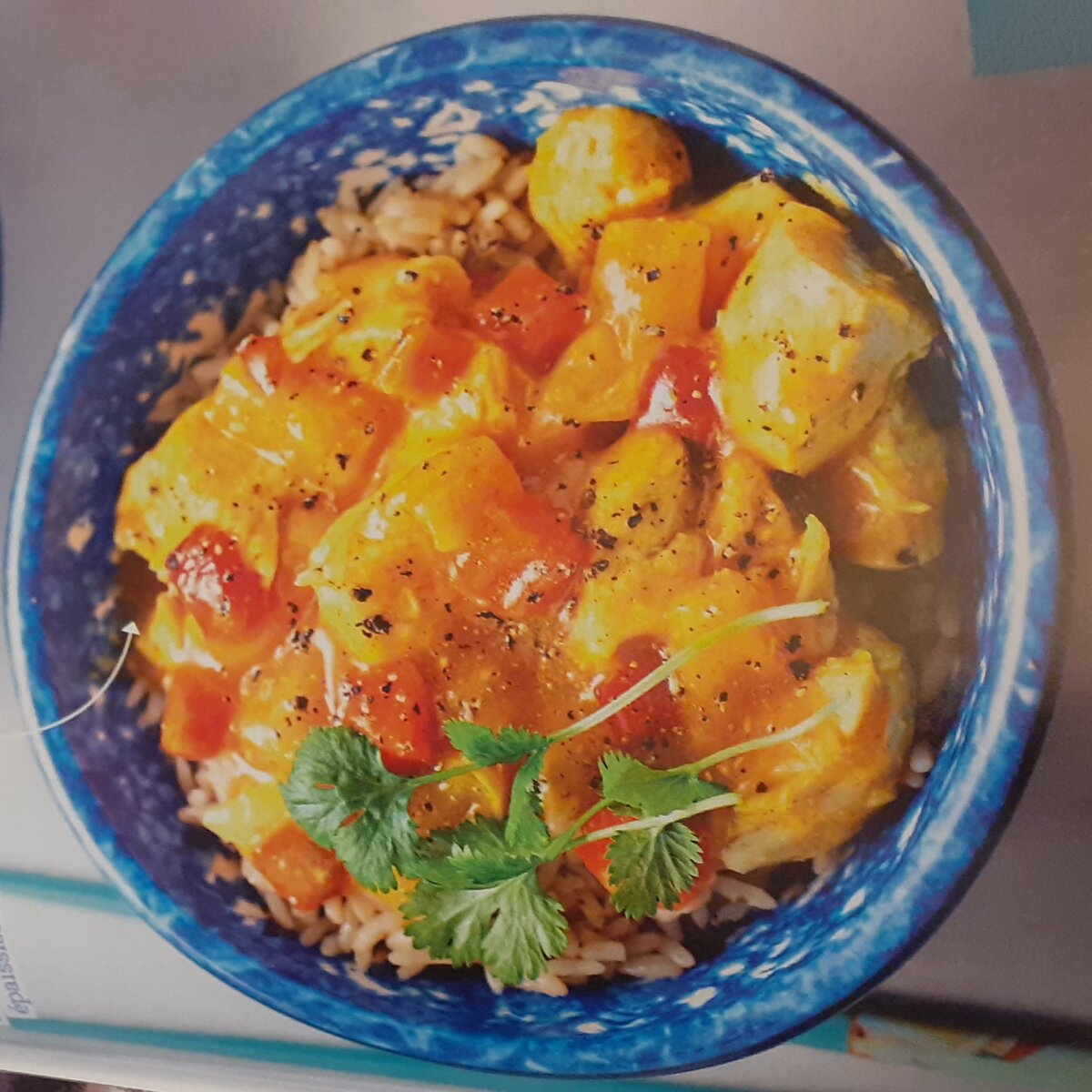 4.Добавить яблочное пюре, поперчить. Аккуратно перемешать. Готовить 5 минут, помешивая. Подавать с рисом и украсить свежим кориандром.
