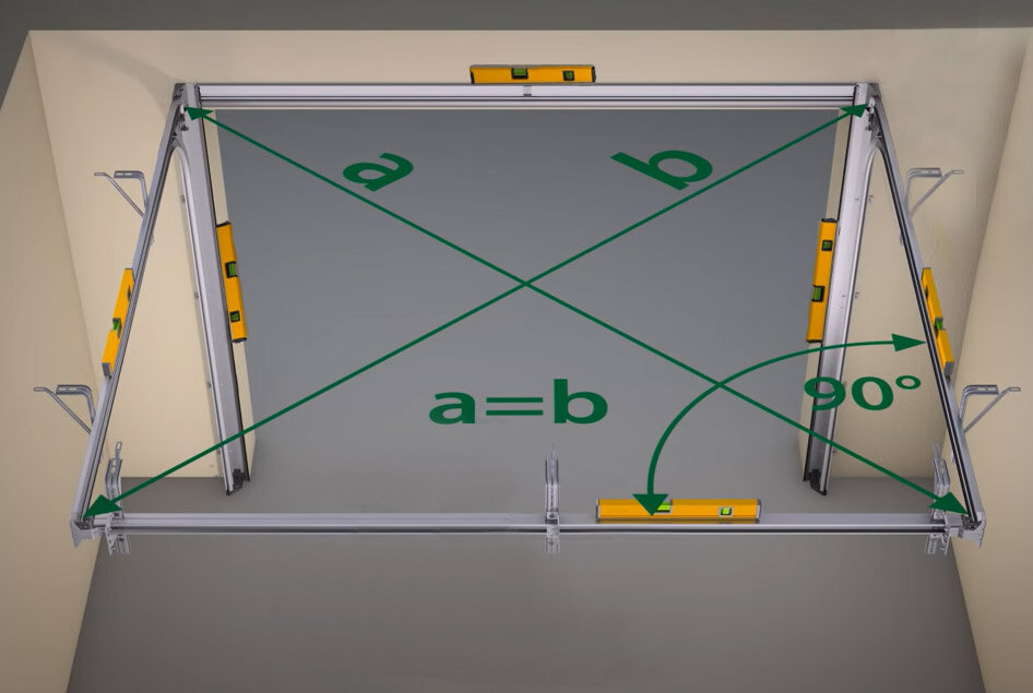 При установке вертикальных и горизонтальных направляющих, не забудьте использовать уровень и отвес. Вертикальные направляющие должны быть в одной плоскости и устанавливаться на подготовленный проем, а при установке и фиксации горизонтальных направляющих, обязательно проверить диагонали, в противном случае щит ворот в верхнем положение будет клинить.