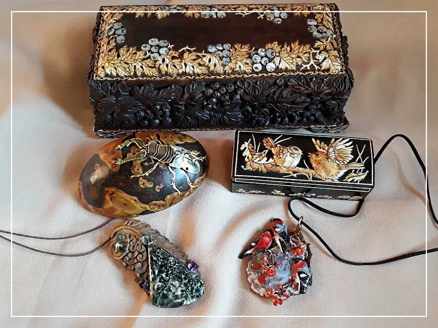 Не умея еще работать с металлом, я стала делать украшения, совмещая резьбу, дерево и камень