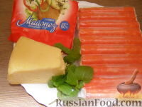 Продукты (на 5 порций)Крабовые палочки - 120 гСыр - 100-150 гМайонез - 4-6 ст. ложекЗелень мяты - по вкусу