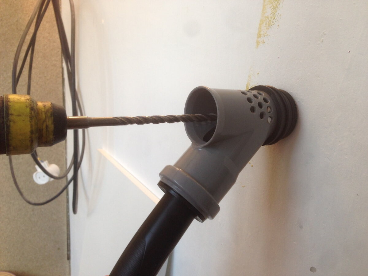 Берём тройник, отпиливаем лишнее ножовкой и сверлим отверстия для притока воздуха сверху. У меня общая площадь отверстий получилась примерно вдвое меньше площади отверстия, в которое входит бур перфоратора. Этого достаточно, чтобы уменьшить забор воздуха спереди - воздушный поток идёт сверху и пыль