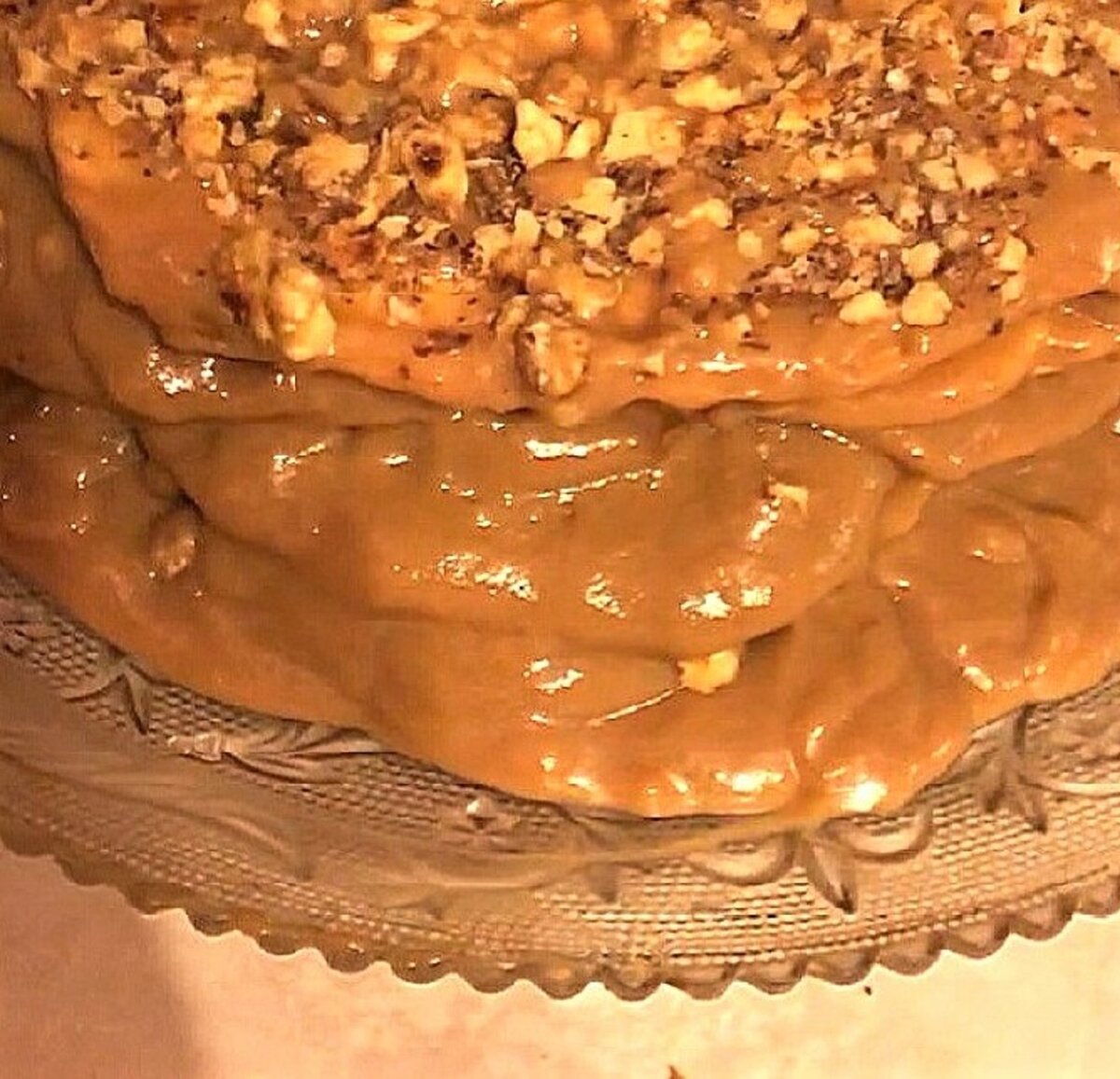 Последний корж сверху немного придавливаю и посыпаю орехами.
