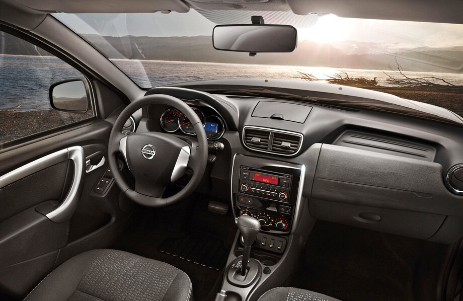 Передняя и приборная панели повторяют дастеровские, но у Terrano иначе организована центральная консоль: другие дефлекторы обдува и мультимедийная система. Также у ниссановской машины нет мультируля в принципе, да и бибикнуть нажатием на центр баранки не получится.