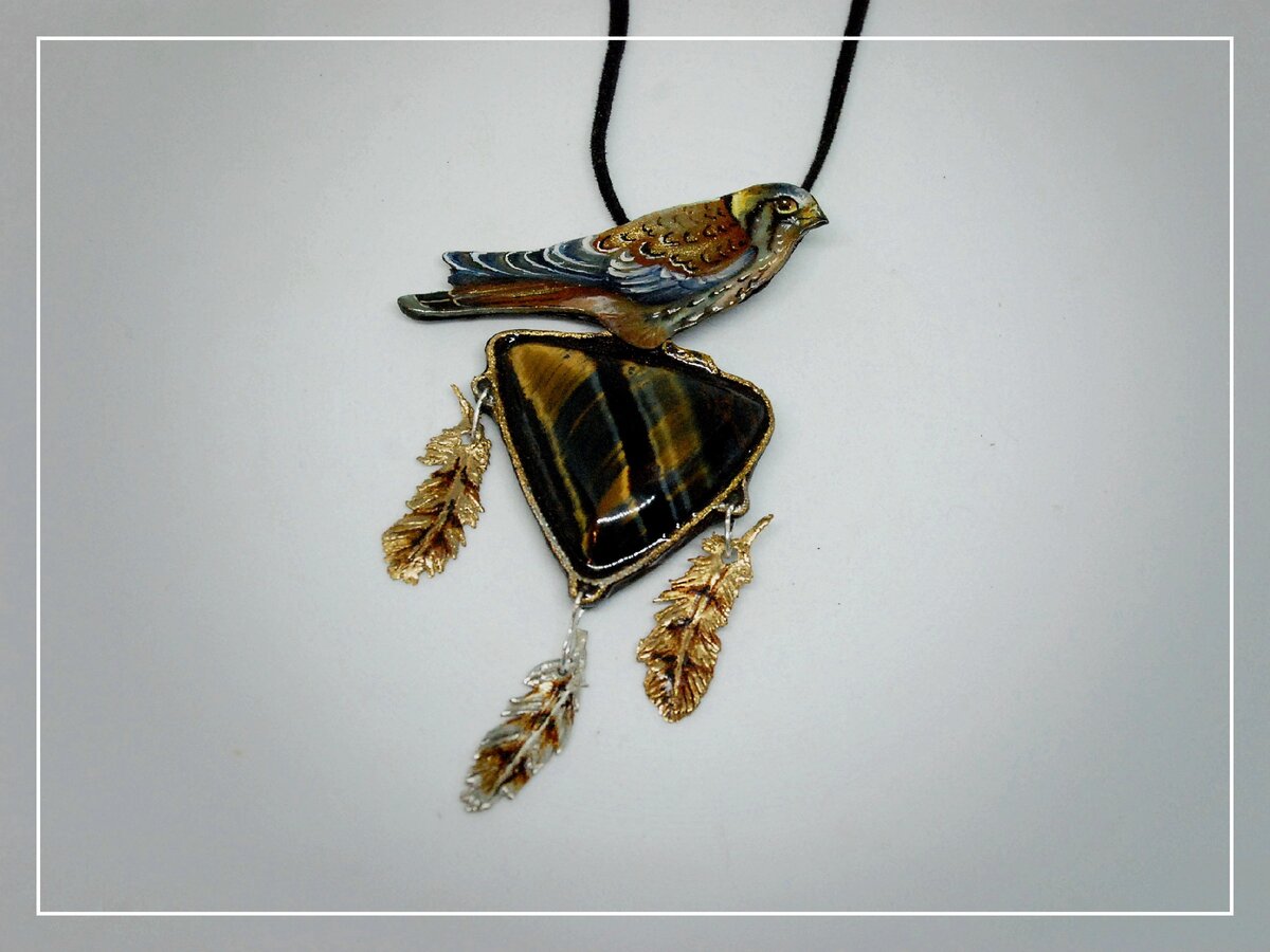 Будущий кулон можно сравнить с конструктором- он состоял из перламутрового сокола, перышек из бронзы и серебра, и самой оправы.